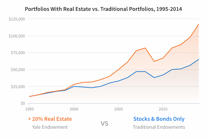 An investor who followed the Yale model of investing 20% of their portfolio in alternatives like real estate would have earned about 2x as much as an investor who used a traditional allocation.
