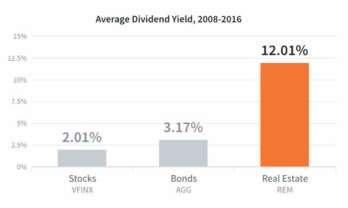Average dividend yield chart represents the average annual dividend yield for the Vanguard 500 Index Fund (VFINX), the iShares Core Aggregate Bond ETF (AGG), and the iShares Mortgage Real Estate Capped ETF (REM), from 2008 to 2016. Source: Yahoo Finance